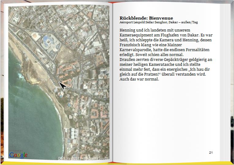 Christoph Benda napsal knihu, ale ne jen tak ledajakou knihu – je totiž autorem georománu Senghor on the Rocks (SOTR). Kniha byla publikována pod licencí Creative Commons Attribution-Sharealike 3.0 Unported License a co ho dělá tolik geo je doprovod každé strany, který tvoří letecké snímky z Google Maps. Díky nim můžete sledovat cestu hlavního hrdiny interaktivně, protože se snímky mění v závislosti na textu – mění se poloha, zoom a dokonce vidíte i pohyb hrdinů románu. Román je trilogií a přečíst si ho můžete zde. Malou překážkou bránící dokonalému čtenářskému zážitku potom může být jazyk, ve kterém je román psán – němčina. Pokud němčinu neovládáte, tak nevadí, rozhodně jde o zajímavý koncept, který stojí za vaši pozornost.