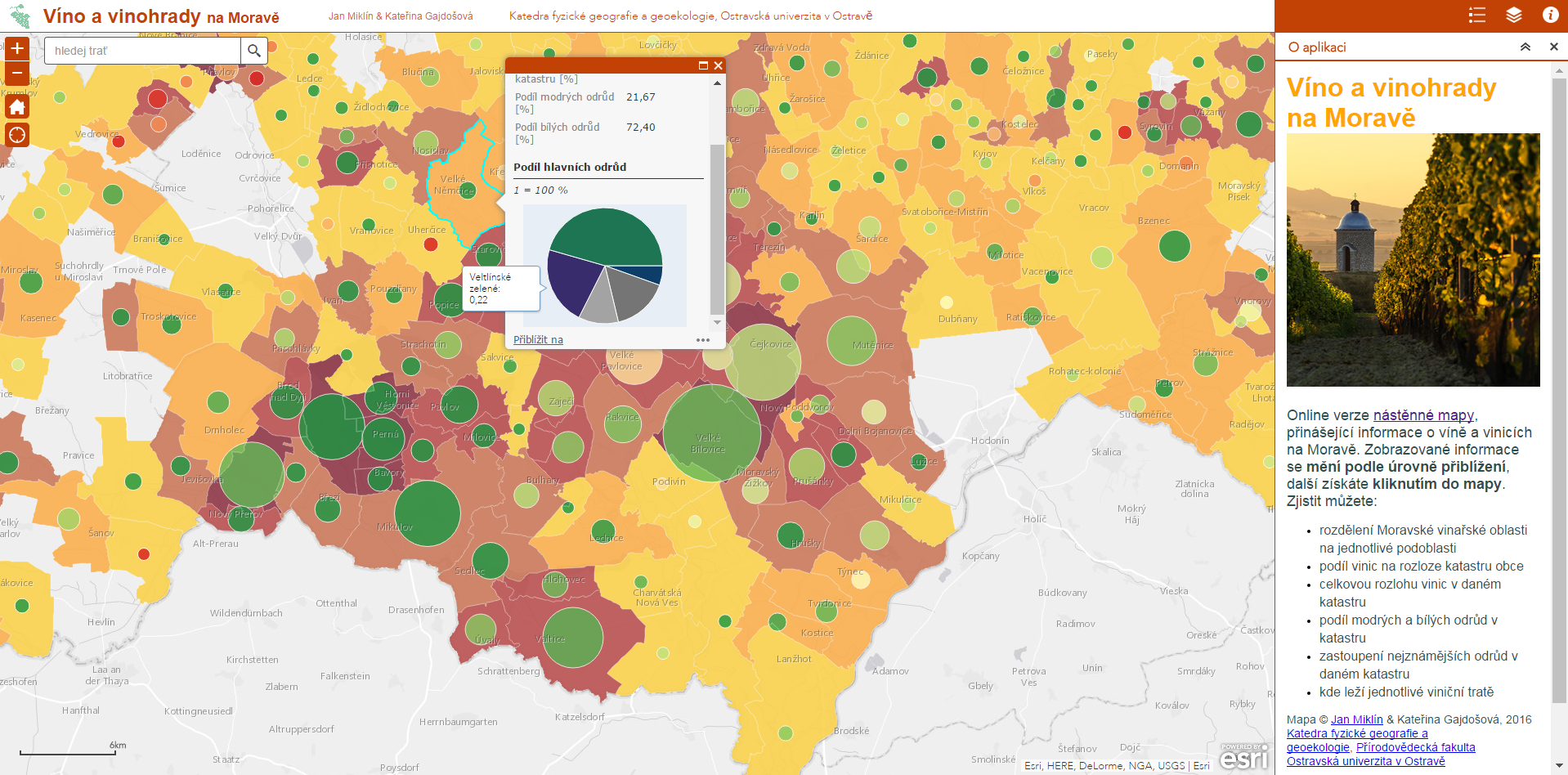 Jaká vína se pěstují v jednotlivých katastrech či kolik hektarů vinohradů tam najdeme a další informace lze snadno zjistit z nové webové mapové aplikace, kterou připravili Jan Miklín a Kateřina Gajdošová z Katedry fyzické geografie a geoekologie Ostravské univerzity. Poměrně podrobná data, která o vinohradnictví spravuje Ústřední kontrolní a zkušební úřad zemědělský, jsou zgeneralizována a převedena do mapové podoby. Kromě rozdělení Moravské vinařské oblasti na podoblasti lze z mapy ke každému katastru zjistit podíl vinic na rozloze katastru, rozlohu vinohradů, poměr bílých a modrých odrůd a také podíl osázené plochy nejznámějšími odrůdami vína. V největším detailu si pak můžete zobrazit jednotlivé viniční tratě, které lze podle názvu vyhledávat.